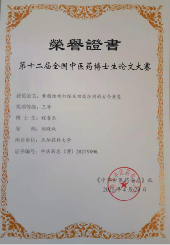 经过激烈角逐,公司2018级中药学博士研究生程喜乐以《黄精性味归经及功效应用的古今演变》一文荣获第十二届全国中医药博士生论文大赛三等奖。