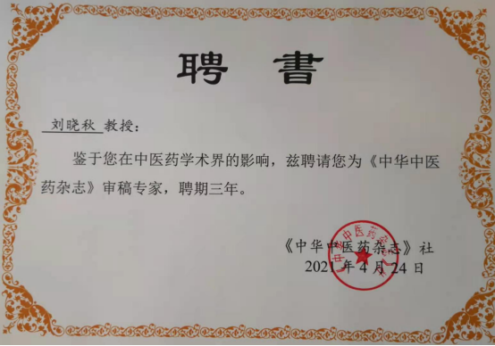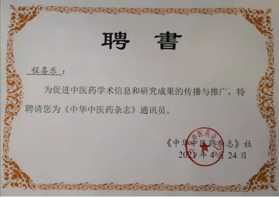 同时,论文指导老师刘晓秋教授被《中华中医药杂志》聘为审稿专家,博士生程喜乐被聘为《中华中医药杂志》通讯员。