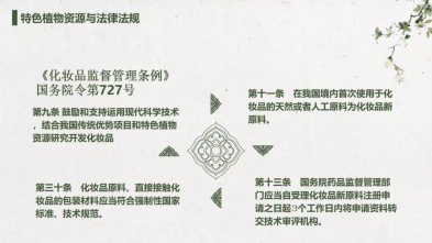 矫筱蔓副主任首先为线上师生介绍了化妆品相关法律法规,并重点讲解了其中与特色植物资源相关条例。说明了当前国家对化妆品产业领域的关注重视,尤其是对特色植物资源开发的支持。并进一步讲解了特色植物资源在化妆品中的使用及目的。之后讲授了在化妆品新原料开发中首先应考虑到安全性问题,其次才是功效,同时符合相关法律法规要求。在研究化妆品功效之前,正确认识化妆品定义十分重要,使用《化妆品分类规则和分类目录》中允许化妆品的功效,通过调节激素、抑菌或消炎达到祛痘目的的不属于化妆品,用于疤痕、烫伤、烧伤、破损等损伤部位的产品也不属于化妆品。又以美白功效为例,介绍了从植物库中筛查得到有目的功效的特色植物资源的方法。矫筱蔓副主任展望了化妆品行业前景,在疫情期间,化妆品行业的情况较其他行业稳定,消费者观念发生了改变,从热衷于购买国外进口产品逐渐转变为支持国产本土品牌,在国家政策的支持鼓励下,未来特色植物资源在化妆品行业中会有较好的发展前景。最后,矫筱蔓副主任对师生们提出的烟酰胺属于化妆品还是药品、药品医疗效果与化妆品美容效果如何区分、新原料注册备案中旧实验数据是否能使用等问题进行了解答。