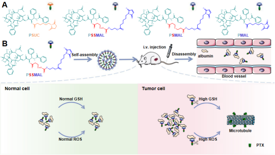 市售的白蛋白结合型紫杉醇纳米制剂被认为是乳腺癌治疗的金标准。然而,不良的药代动力学特性以及外源白蛋白载体的免疫原性限制了它的应用。为了突破市售白蛋白结合型紫杉醇制剂的局限性,williamhill官网无涯创新公司孙进-何仲贵课题组和英国威廉希尔公司刘东春课题组合作设计了氧化还原响应的内源性白蛋白结合型紫杉醇前药纳米药物递送策略。通过不同的连接键(硫醚键和二硫键)将紫杉醇与白蛋白结合型马来酰亚胺结合。这些紫杉醇前药可以在没有任何辅料的情况下在水溶液中自组装形成均匀的球形纳米粒。这些纳米粒在静脉给药后立即结合血液中的白蛋白,并迅速崩解成小的前药-白蛋白纳米聚集体,通过白蛋白受体介导的主动靶向促进紫杉醇前药在肿瘤区域的蓄积。同时,前药具有氧化还原双敏感的释药属性,能够在肿瘤在氧化还原微环境中更快释放紫杉醇。此外,含二硫键的前药-白蛋白纳米聚集体在体内表现出更长的循环时间和优异的抗肿瘤功效。这种简单而灵活的策略整合了白蛋白的仿生特性,肿瘤氧化还原响应性按需药物释放,并为开发高效的抗肿瘤纳米药物提供了新的机会。