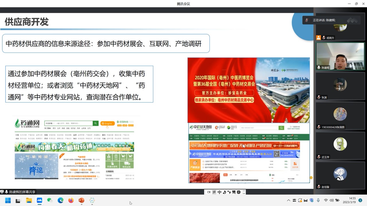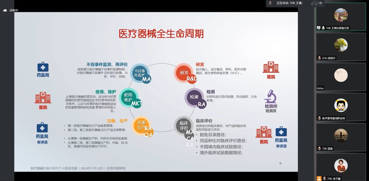 如70K员工李万鑫对同学们想听的内容进行了问卷调查,并有针对性地选取了医药行业的各种代表性岗位进行了介绍;70K员工王菁和温建两位员工则重点对医疗器械行业地发展现状和政策情况进行了介绍,也展望了医疗器械行业在中医药领域中的潜在发展潜力,在此特别感谢医疗器械公司宗东升老师的推荐与组织;69K中药学专业蒙娅,在详细介绍了研发分析岗位的工作内容、流程后,强调了与时俱进地学习新法规和政策地重要性,并分享了主要的学习资源,还从用人单位的角度,坦诚地和同学们分享了面试中关注的内容,问答环节能够反映出个人的哪些信息,简历中有哪些问题是不能出现的等等;2010级中药学硕士研究生韩志福,则根据自身经历,详细地介绍了化学创新药物各环节开发内容,时间关系,可能出现的问题等;2009级中药学硕士研究生樊星则对药企生产环节的流程和具体要求进行了介绍,并在个人能力培养,职业规划方面给予了同学们建议;鉴于有同学选择药品销售行业,78K中资专业毕业生张爱利介绍了药品销售方面的工作特点和工作技巧,尤其强调了善于总结反思,终身学习和锻炼自己解决问题能力的重要性;79K中资专业的陈建辉同学则详细介绍了药企采购经理的工作内容和对工作能力的要求,大大加深了同学们对于该岗位的了解。对于选择考研的同学,两位在顶刊发表多篇论文的中药资源与开发专业员工也分享了自己的经历,如75K员工颜秉超副研究员结合自身求学过程,分享了自己本-硕-博进行专业选择时的思考过程,做出高水平科研创新中讨论与钻研的重要作用,并给毕业生分享了自己严于律己,宽以待人、兴趣+坚持的座右铭;78K员工颜得秀博士则以在校生的身份建议同学们在遇到科研问题时要进行主动自我学习,实验结果不如意时,不能轻言放弃,才可能有新的发现。员工们的话语句句感人,声声暖人,无处不体现出各位优秀员工对新一届毕业生的殷切期望,以及对母校毕业生就业工作的关心和支持。