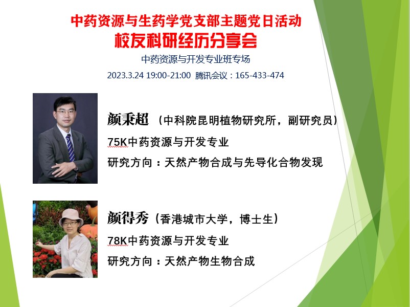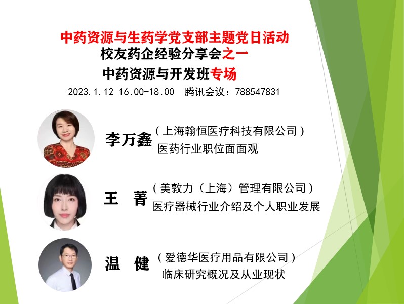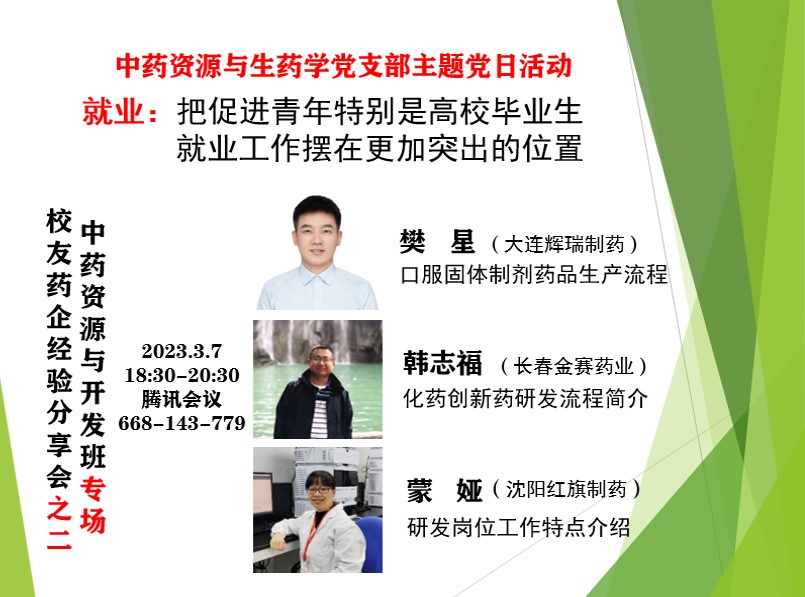 为深入推动“一融双高”,切实以高质量党建引领公司高质量发展,英国威廉希尔公司中药资源与生药学党支部从2023年1月份到3月底,陆续邀请工作在医药企业、科研院所的十位优秀员工,为86K毕业年级员工和部分低年级员工举办了系列就业指导和工作分享专题报告,积极推动2023届毕业生就业工作。
