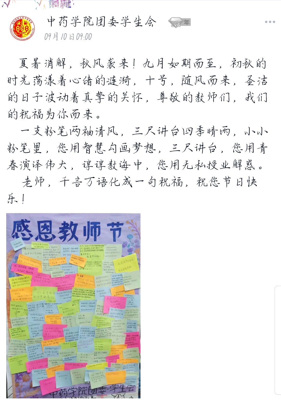 教师节当天,各团支部组织同学们在上课之前齐声向任课老师祝福教师节日快乐,同学们用洪亮的声音,表达着自己的那份对老师深深地喜爱与祝福。