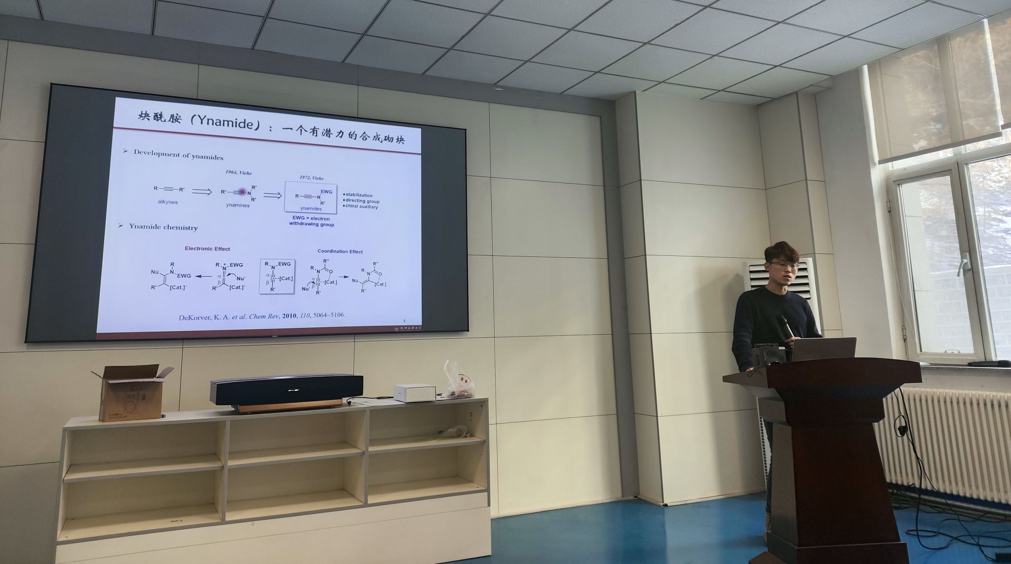 杨璐基于色胺炔酰胺这一重要合成砌块,针对几类结构复杂多样且具有广泛生物活性的单萜类吲哚生物碱,讲解一种高效的、通用的、实用的全新合成策略,并总结交流合成中的设计和探索。