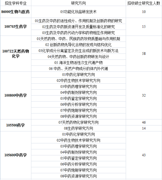 招生专业:1008中药学(博士)、100703生药学(博士)、1008中药学(硕士)、1056中药学(硕士)、100703生药学(硕士)、1055药学(生药学方向)(硕士)、0860生物与医药(功能化妆品研究方向)(硕士)