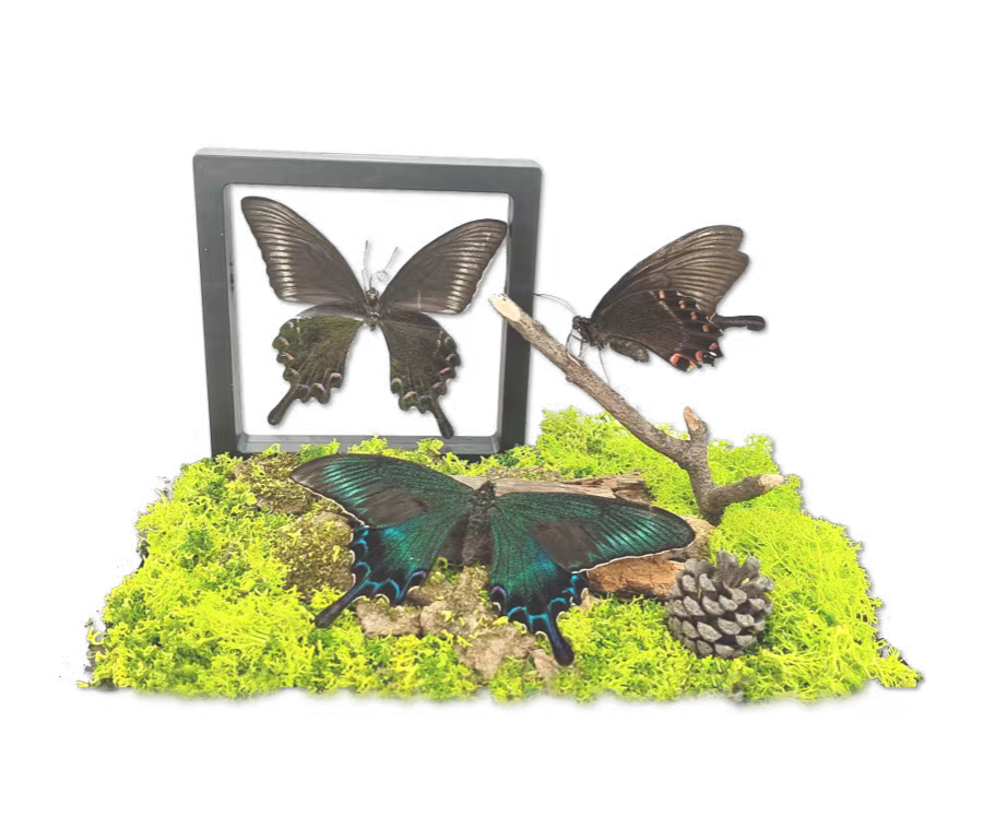 “吾爱梁祝婉转曲,凄凄美美有悲音”,从古到今,梁祝这个凄美的爱情故事,这曲婉转千古绝唱,不知感染了世间多少有情人。作品以此中国古代传说故事为背景,选择素有“森林绿皇后”美誉的绿带翠凤蝶为制作对象,引入自然造景的设计理念,以蝴蝶轻盈的舞姿和色彩斑斓为表现形式,展现自然环境下蝴蝶的灵动和自由,象征人们对勇敢和自由的追求,也寓意人生的不断进化和成长。回溯本体,标本的意义还在于对生物瑰丽的永久留存,绿带翠凤蝶作为东北地区最具观赏价值的蝴蝶之一,是春季常见的蝴蝶,寓意着新生和希望,预示着新的开始和美好的未来;绿带翠凤蝶还是一种喜欢自由飞翔的蝴蝶,寓意着人们追求自由和理想的心态和努力,也启示我们要爱护环境、爱护共同的家园。