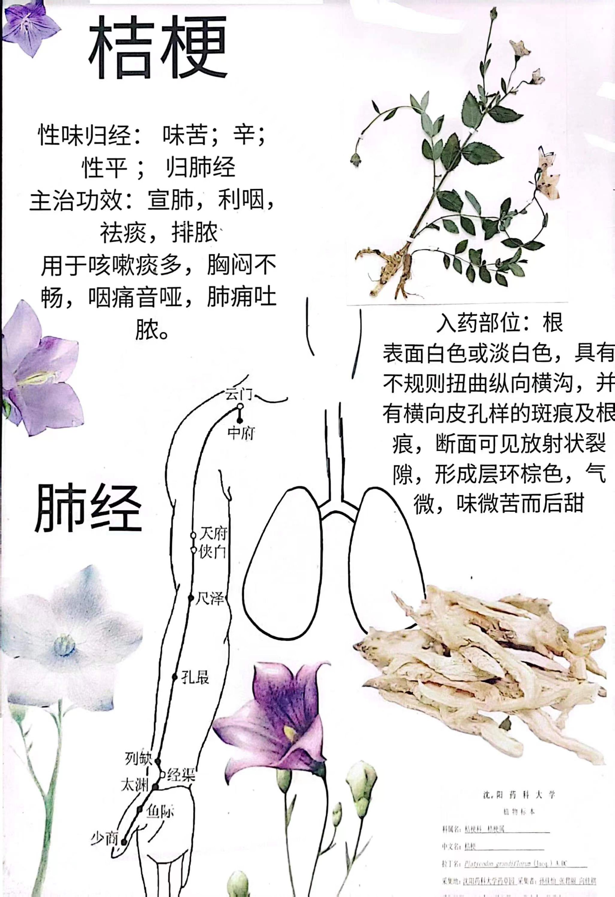 桔梗(Platycodon grandiflorus(Jacq.) A. DC.)是桔梗科桔梗属的多年生草本植物,根粗壮,李时珍曾言:“此草之根结实而耿直,故名桔梗”。桔梗用药历史悠久,是宣肺利咽祛痰的常用药,宋代诗词中指出:“肺病恶寒望劝酬,桔梗作汤良可沃”。本作品以桔梗为制作对象,在展示桔梗植物基本形态特征的同时,还手绘制了肺及肺经的准确位置及走向,在此基础上,还恰当地将桔梗的药用部位、性味归经、功能主治等与原植物标本有机结合在一起,体现了桔梗“专入肺经,专治肺病”的作用特点。作品标题取自桔梗的宣肺祛痰的功效,即“宣肺祛痰桔梗根”,共同体现了桔梗的功效及用药部位。相比于传统植物标本,该作品在满足植物标本鉴定之余,还将与其药材功效相结合,扩大了植物标本之与中医药文化的影响力。