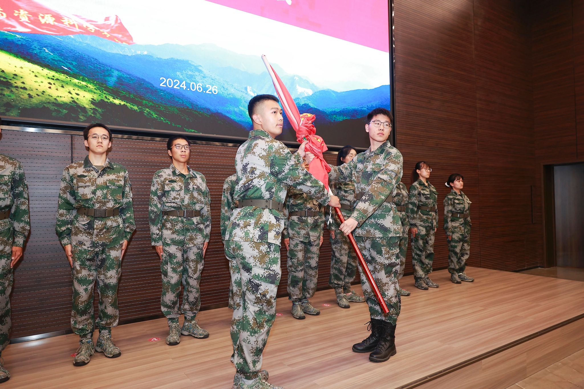 第十六届科考队队长、87期药学专业八班李年发向第十七届科考队队长、89期生物工程专业二班孔振儒交接队旗。